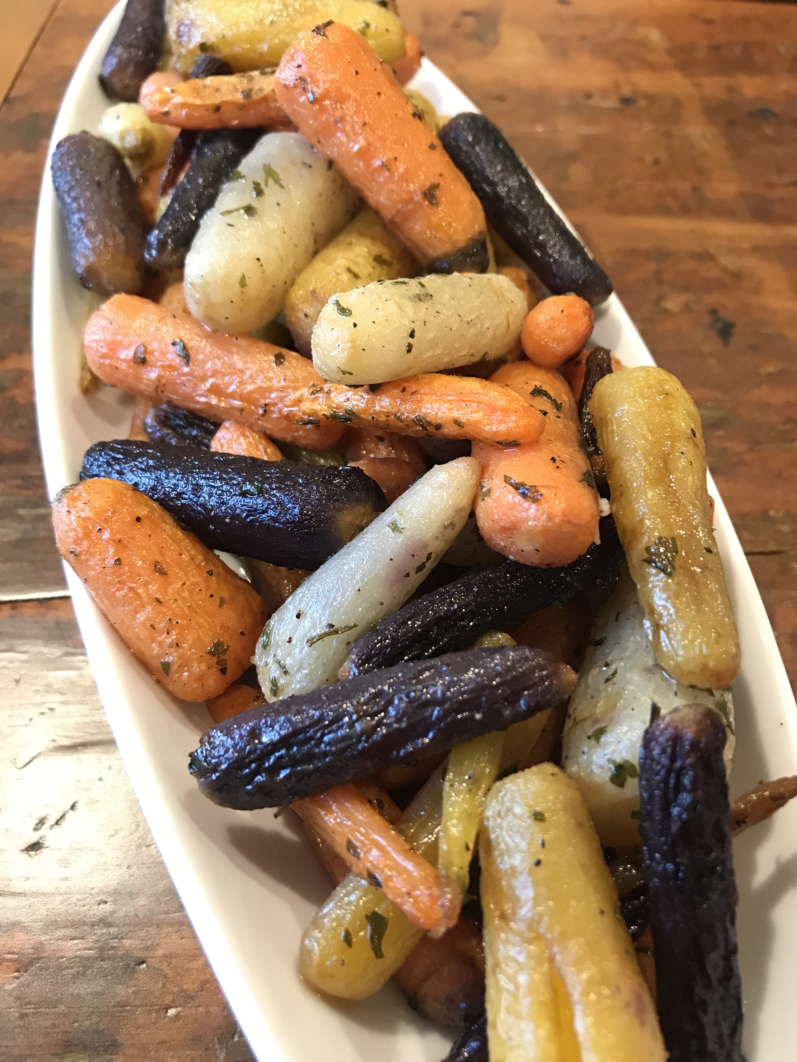 - Combine the first four ingredients (carrots, salt/pepper, olive oil, dried parsley) on a sheet tray and place into preheated oven for 30 – 35 minutes.